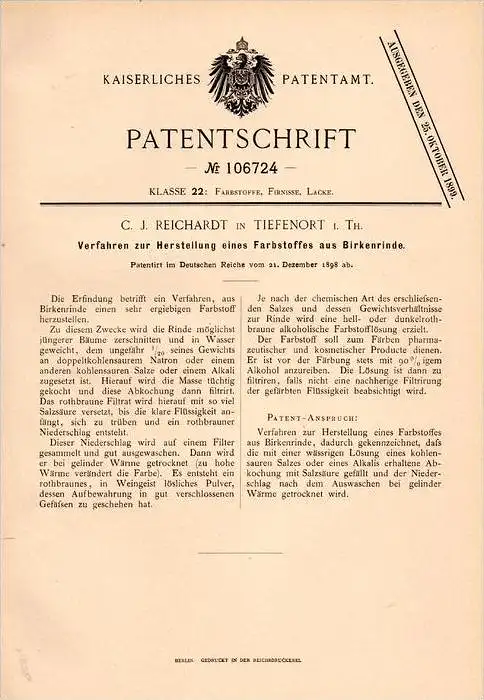 Original Patentschrift - C.J. Reichardt in Tiefenort i. Thüringen , 1898 , Farbstoff aus Birkenrinde !!!