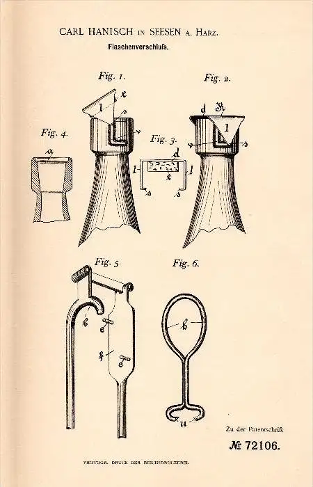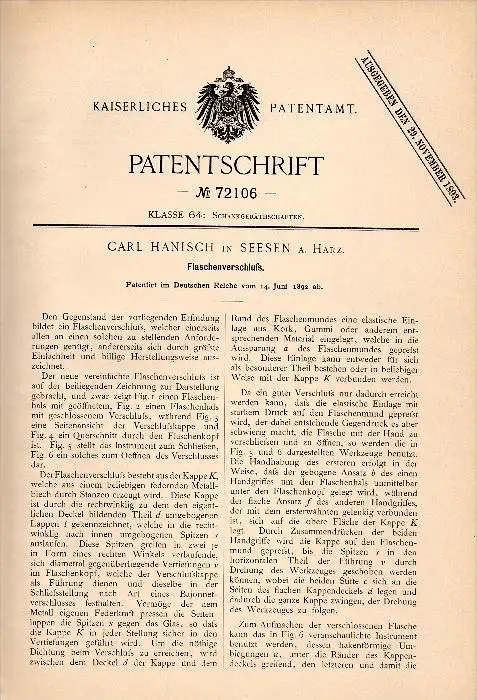 Original Patentschrift - Carl Hanisch in Seesen a. Harz , 1892 , Verschluß für Flaschen , Flasche , Goslar !!!