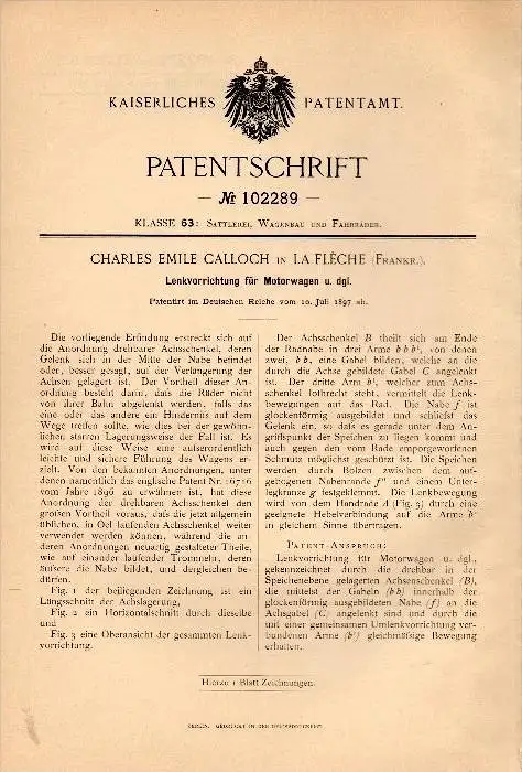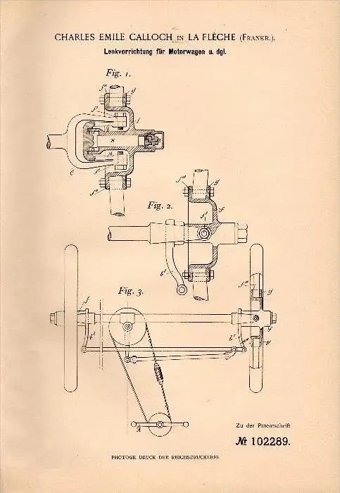 Original Patentschrift - Ch. E. Calloch dans La Flèche , 1897, Direction assistée pour véhicules à moteur , automobile !