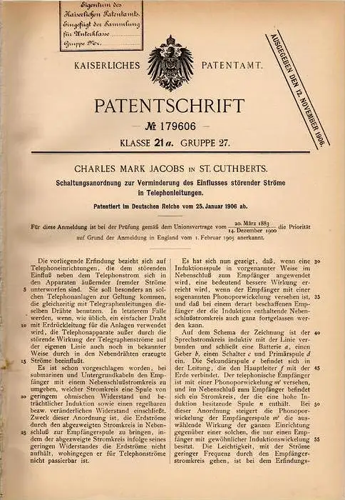 Original Patentschrift - Ch. Jacobs in St. Cuthberts , 1906 , Circuit for telephone !!!
