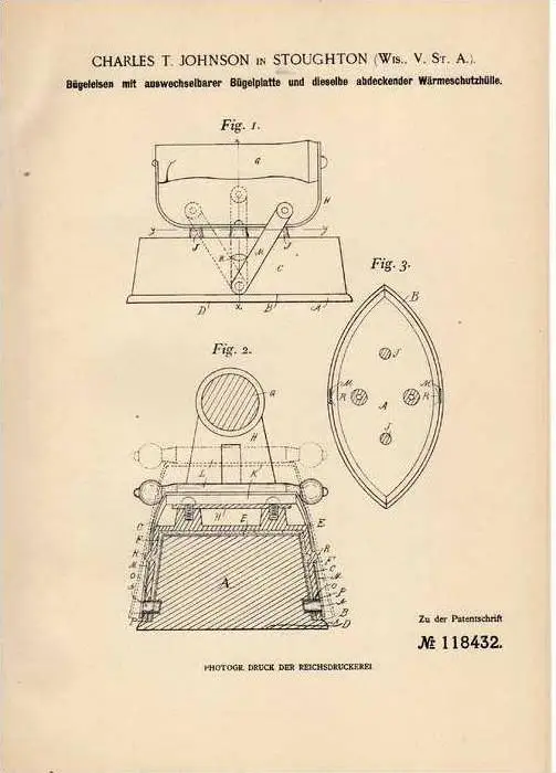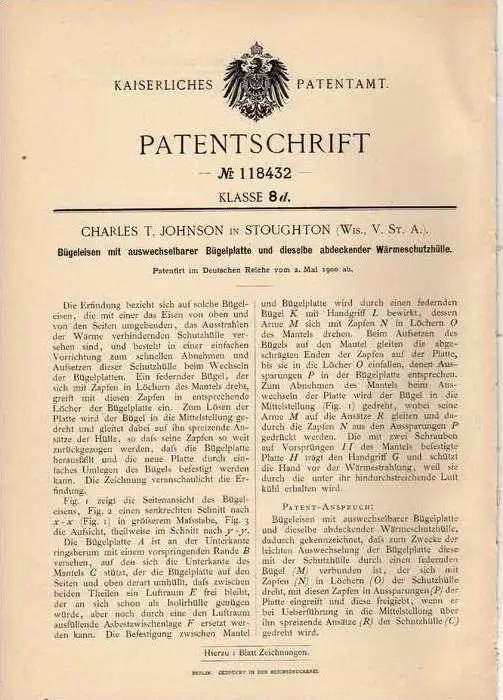 Original Patentschrift - Ch. Johnson in Stoughton , 1900 , Bügeleisen !!!