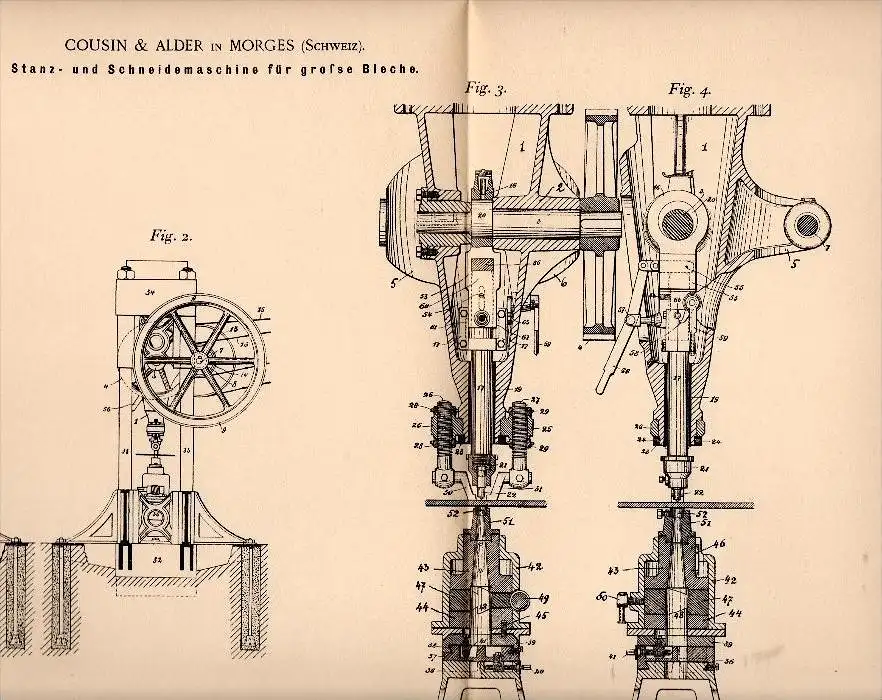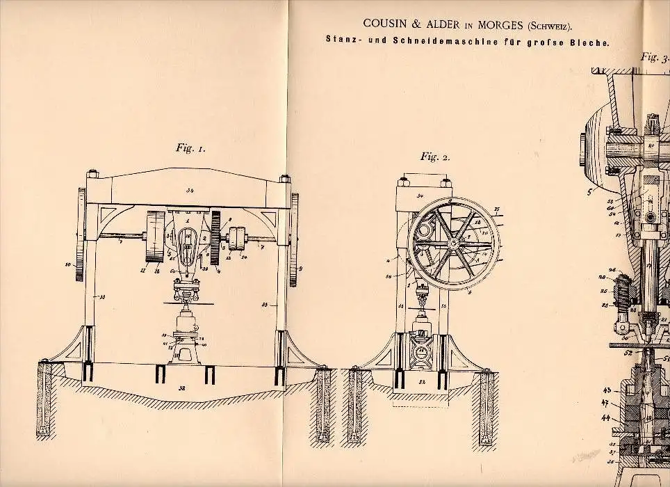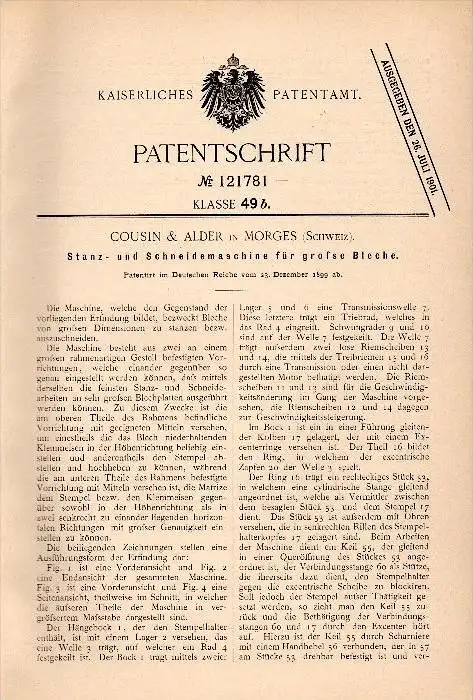 Original Patentschrift - Cousin & Alder in Morges , Schweiz , 1899 , Stanz- und Schneidemaschine , Metallbau !!!