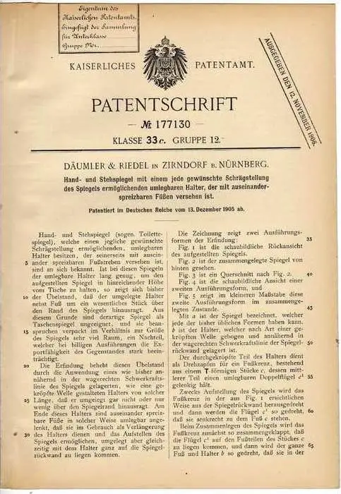 Original Patentschrift - Däumler & Riedel in Zirndorf b. Nürnberg , 1905 , Hand- und Stehspiegel , Spiegel !!!