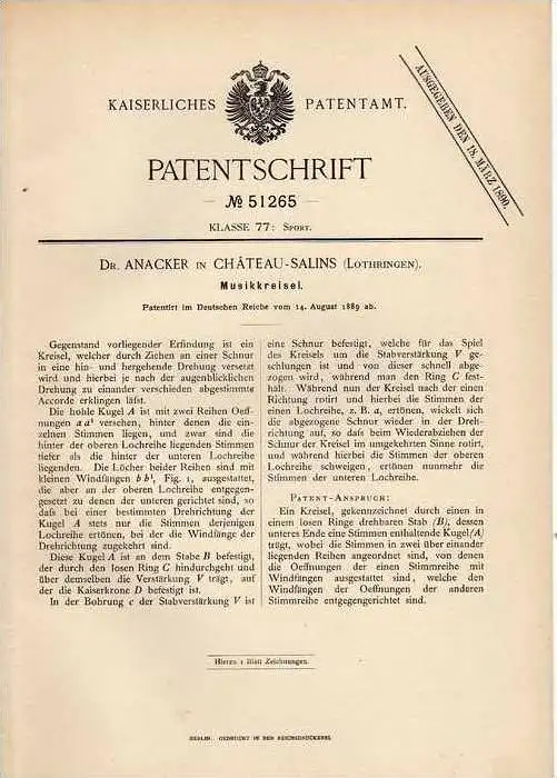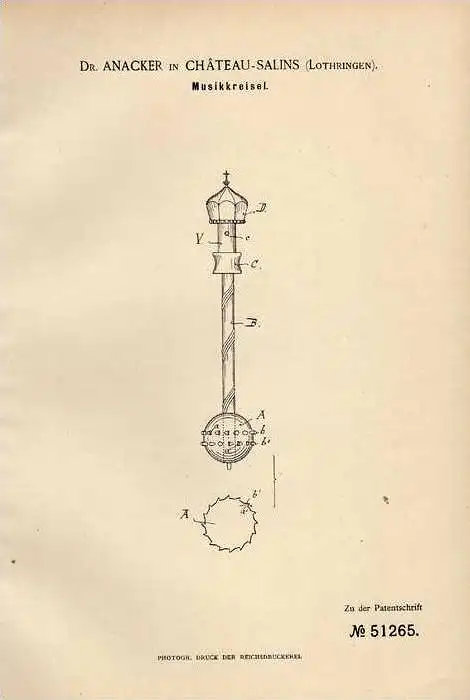 Original Patentschrift - Dr. Anacker in Chateau - Salins ,1889, Kreisel , Musique centrifuge , centrifugal Brummkreisel