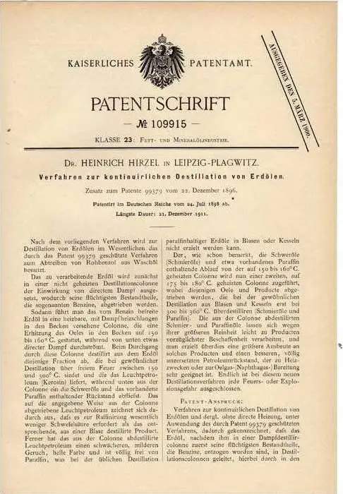 Original Patentschrift - Dr. H. Hirzel in Leipzig - Plagwitz , 1898 , Destillation von Erdöl , Öl !!!