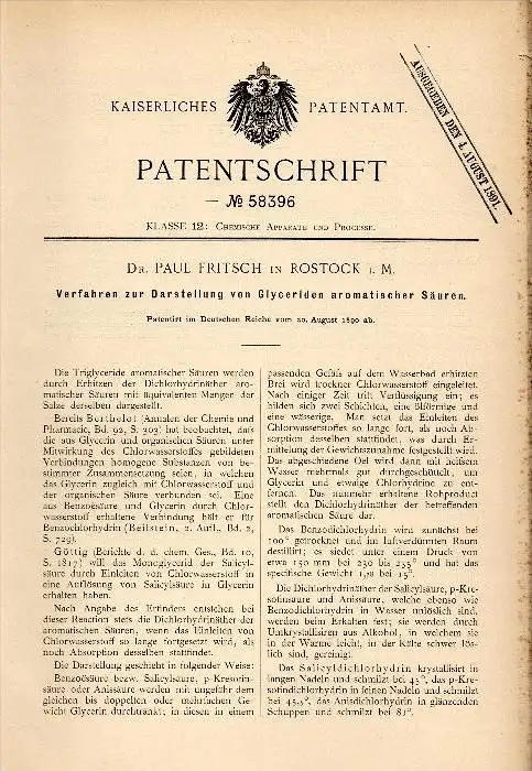 Original Patentschrift - Dr. Paul Fritsch in Rostock i. Mecklenburg , 1890 , Darstellung von Glyceriden , Chemie , Labor