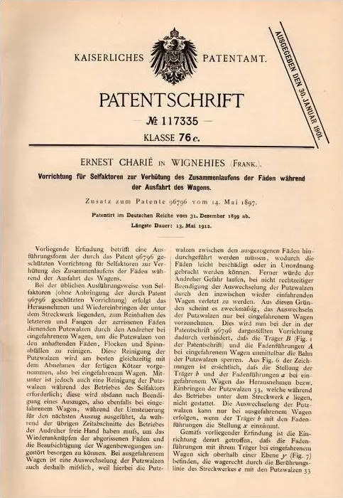 Original Patentschrift - E. Charié in Wignehies , 1899 , Appareil pour machine à filer !!!