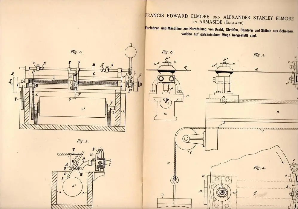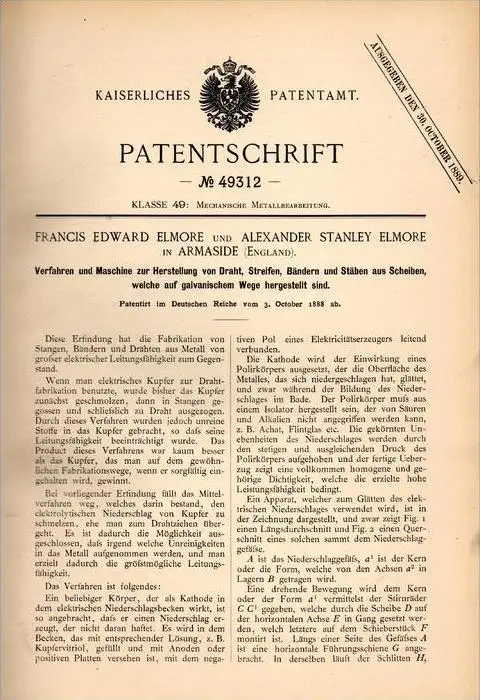 Original Patentschrift - E. Elmore in Armaside , Cumbria , 1888 , Machine for wire production !!!