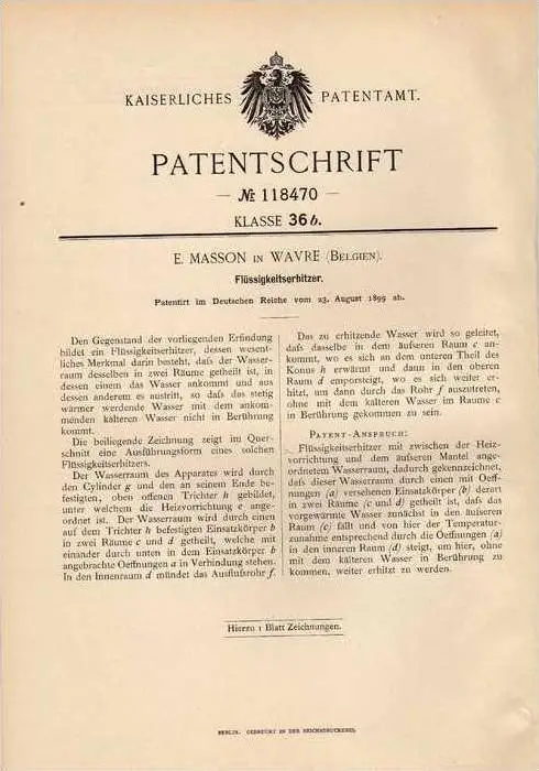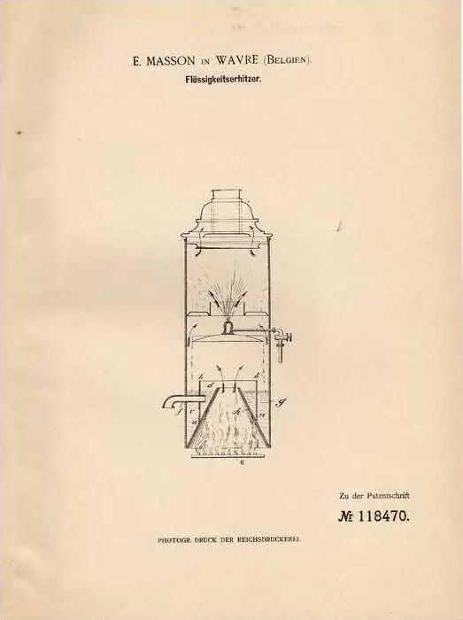 Original Patentschrift - E. Masson in Wavre , 1899 , Erhitzer für Flüssigkeit !!!