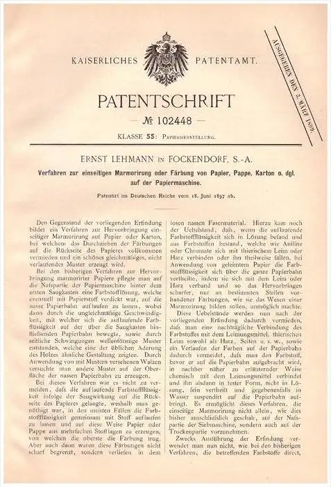 Original Patentschrift - Ernst Lehmann in Fockendorf , 1897 , Marmorierung von Papier , Papiermaschine , Pleißenaue !!!