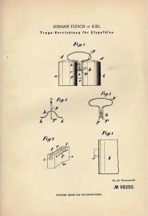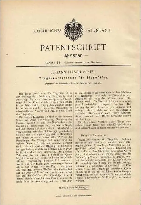 Original Patentschrift - Essgefäße Tragevorrichtung , 1897 , J. Flesch in Kiel !!!