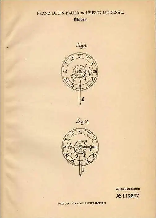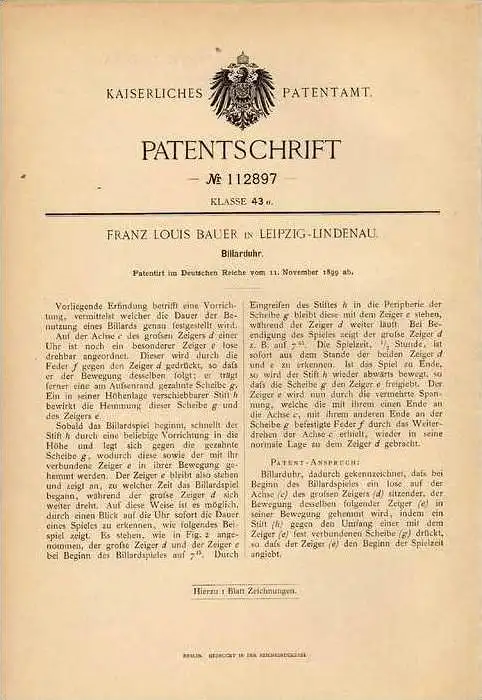 Original Patentschrift - F. Bauer in Leipzig - Lindenau , 1899 , Billiarduhr , Billiard !!!