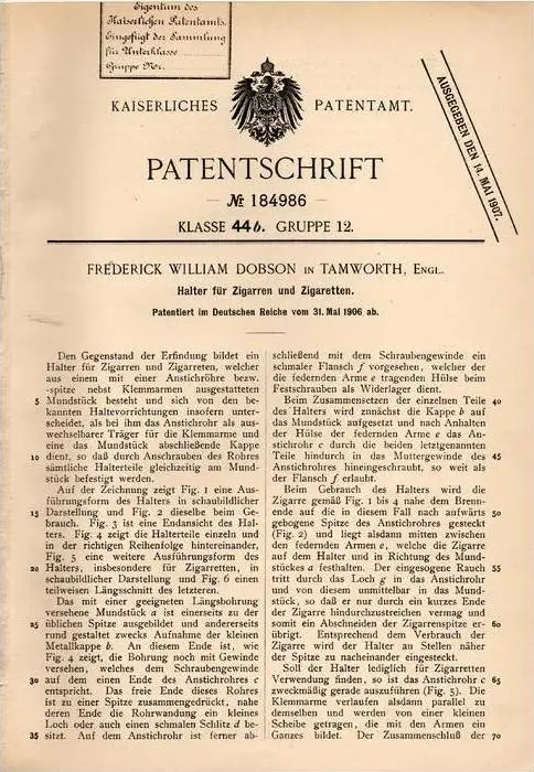 Original Patentschrift - F. Dobson in Tamworth , England , 1906 , Halter für Cigarren und Zigaretten , Cigar !!!