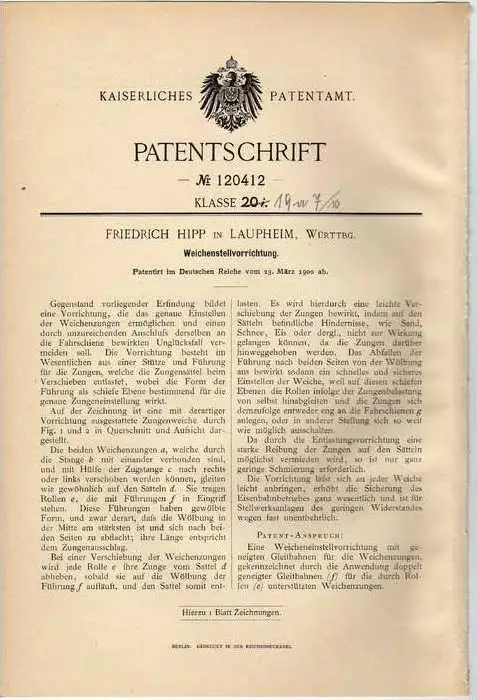 Original Patentschrift - F. Hipp in Laupheim , 1900 , Weichensteller , Eisenbahn , Schiene !!!