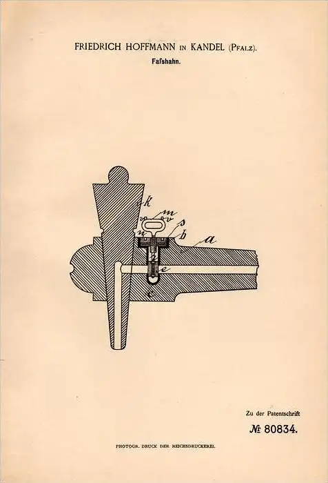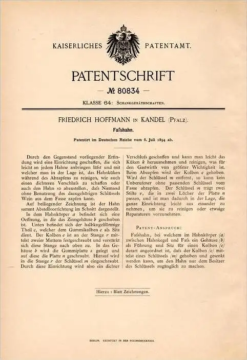 Original Patentschrift - F. Hoffmann in Kandel i. Pfalz , 1894 , Faßhahn , Zapfhahn , Kneipe , Bar , Schankgeräte !!!