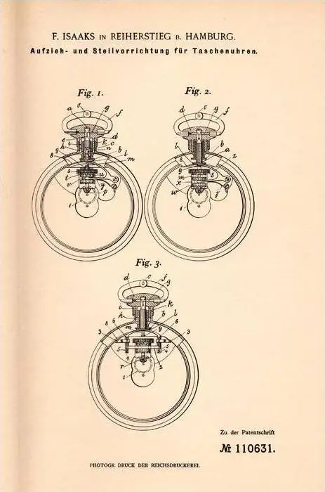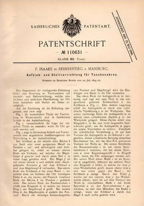 Original Patentschrift - F. Isaaks in Reiherstieg b. Hamburg , 1899 , Aufzieh- und Stellvorrichtung für Taschenuhr !!!