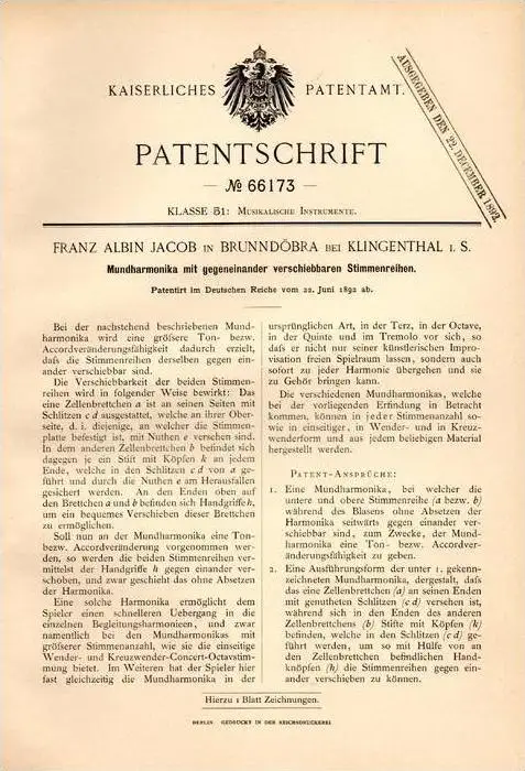 Original Patentschrift - F. Jacob in Brunndöbra b. Klingenthal i.S., 1892 , Mundharmonika !!!