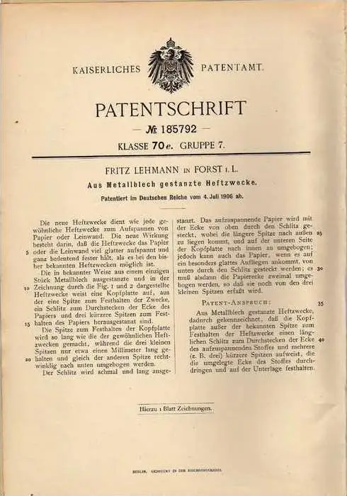 Original Patentschrift - F. Lehmann in Forst i.L., 1906 , Reißzwecke , Heftzwecke , Zwecke !!!