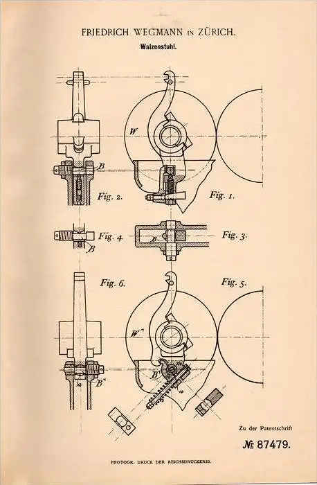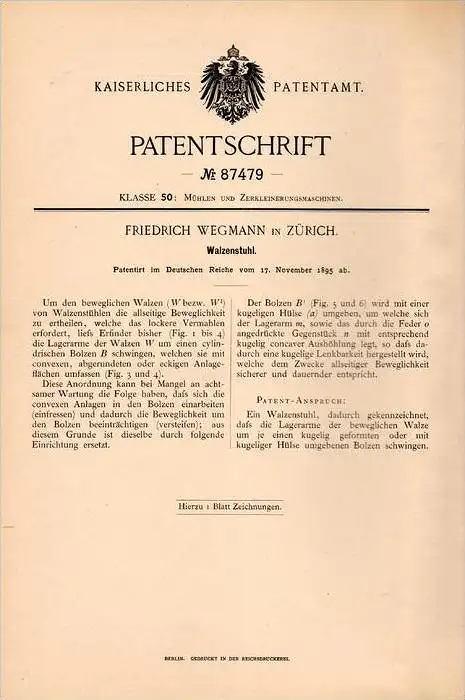 Original Patentschrift - F. Wegmann in Zürich , 1895 , Walzenstul , Mühle , Müller !!!