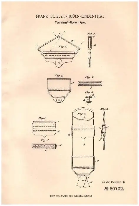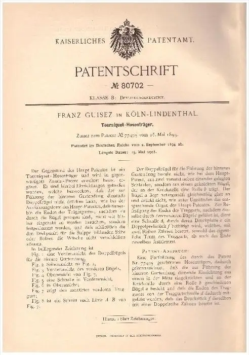 Original Patentschrift - Franz Guisez in Köln - Lindethal , 1894 , Tourniquet - Hosenträger !!!