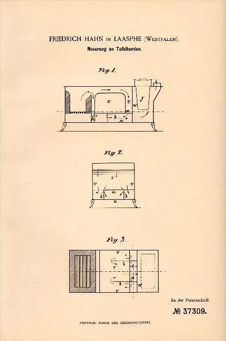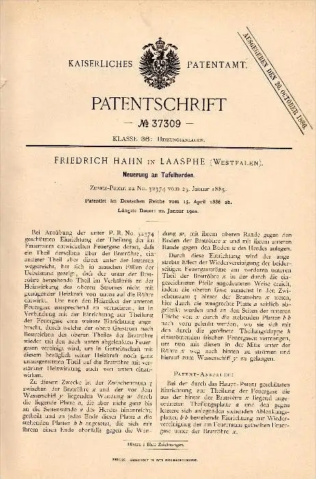 Original Patentschrift - Friedrich Hahn in Bad Laasphe , Westfalen , 1886 , Tafelherd , Herd , Ofen , Kochherd !!!