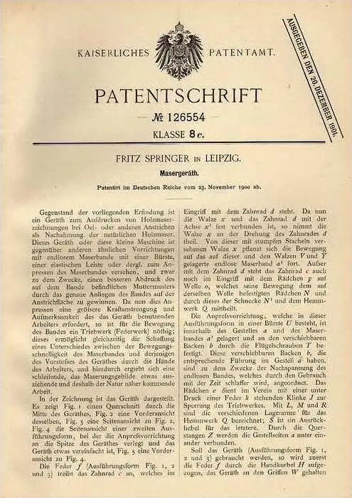 Original Patentschrift - Fritz Springer in Leipzig ,1900, Masergeräth für Möbel !!!