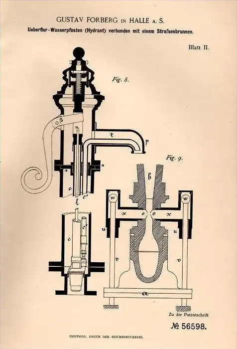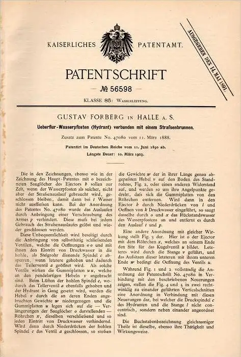 Original Patentschrift - G. Forberg in Halle a.S., 1890 , Hydrant verbunden mit Straßenbrunnen , Brunnen !!!