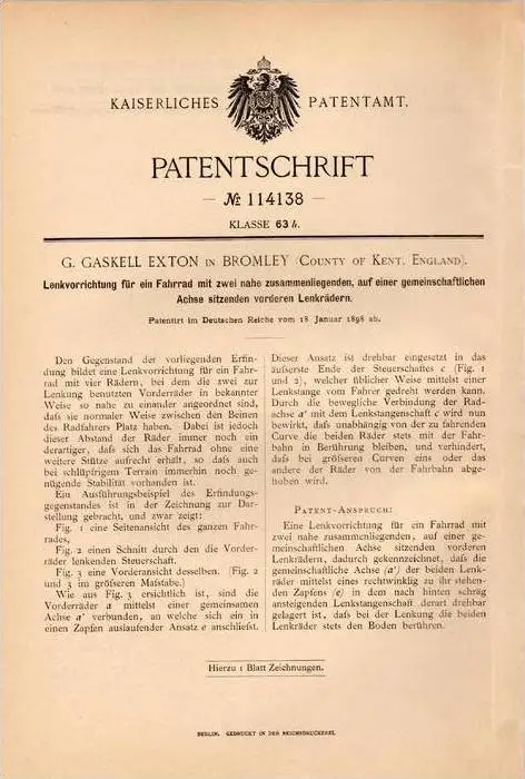 Original Patentschrift - G. Gaskell in Bromley , Kent , 1898 , Steering for bicycle with two steering wheels , London !!