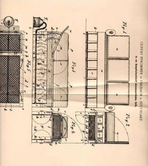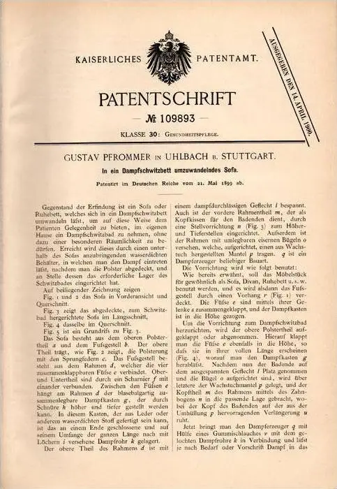 Original Patentschrift - G. Pfrommer in Uhlbach b. Stuttgart , 1899 , Sofa in Dampfschwitzbett umwandelbar !!!