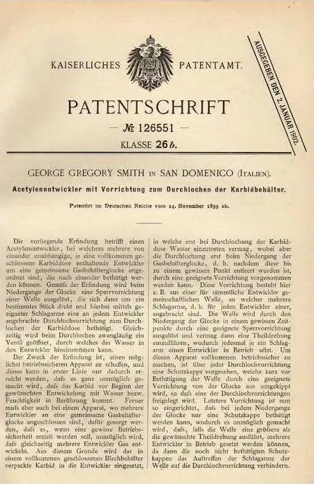 Original Patentschrift - G.Gregory Smith in San Domenico , 1899 , Acetylenentwickler !!!