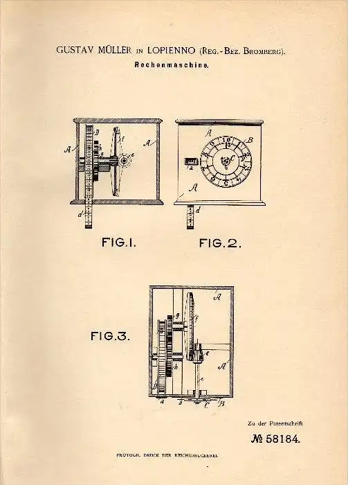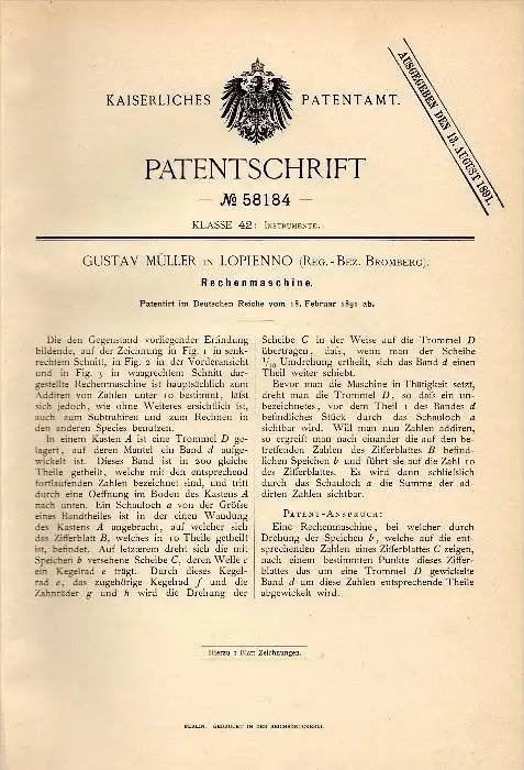 Original Patentschrift - Gustav Müller in Lopienno , 1891 , Rechenmaschine , Mathematik , Schule , Rechnen !!!