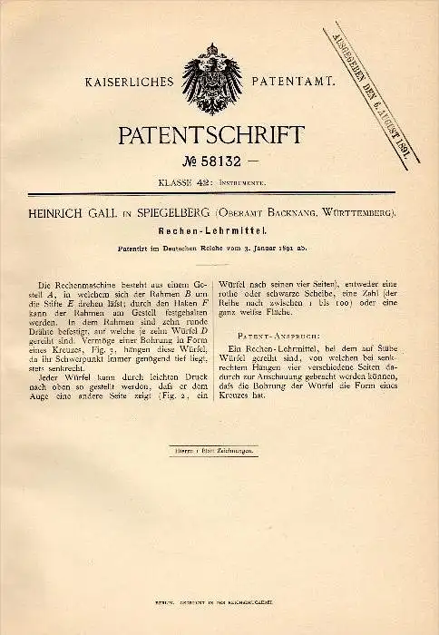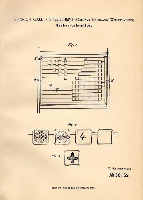 Original Patentschrift - H. Gall in Spiegelberg b. Backnang , 1891 , Rechen - Lehrmittel , Schule , Mathematik , Rechner