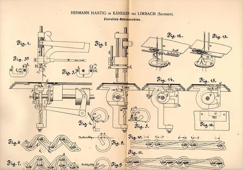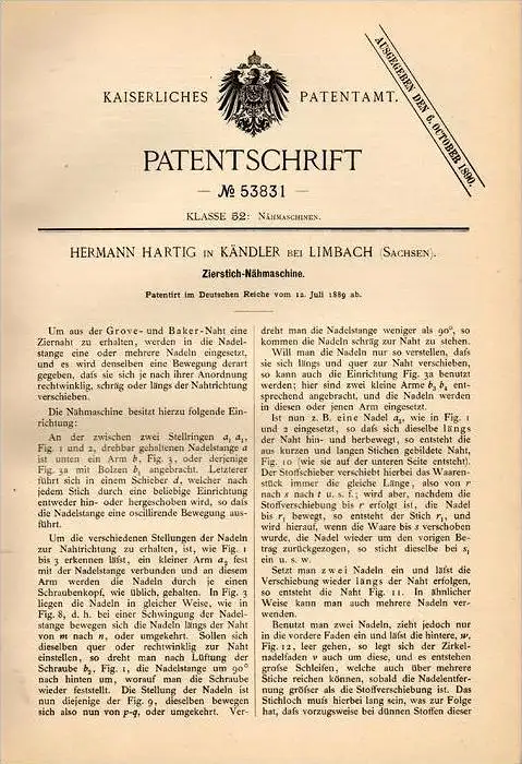 Original Patentschrift - H. Hartig in Kändler b. Limbach i.S. , 1889 , Zierstich - Nähmaschine , Näherei !!!