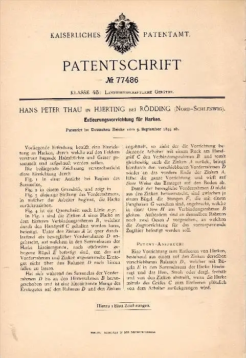 Original Patentschrift - H.P Thau in Hjerting b. Rödding , 1893 , Entleerer für Harken , Agrar , Rødding Kommune !!!