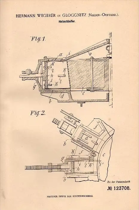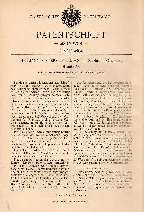 Original Patentschrift - Hermann Wegerer in Gloggnitz , 1900 , Holzschleifer , Tischlerei , Holz !!!