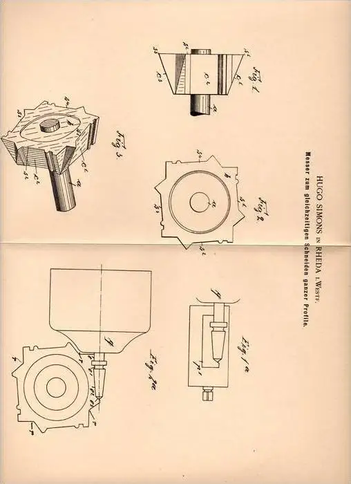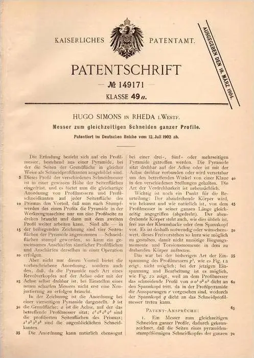 Original Patentschrift - Hugo Simons in Rheda i. Westf., 1902 , Messer zum Schneiden von Profil !!!