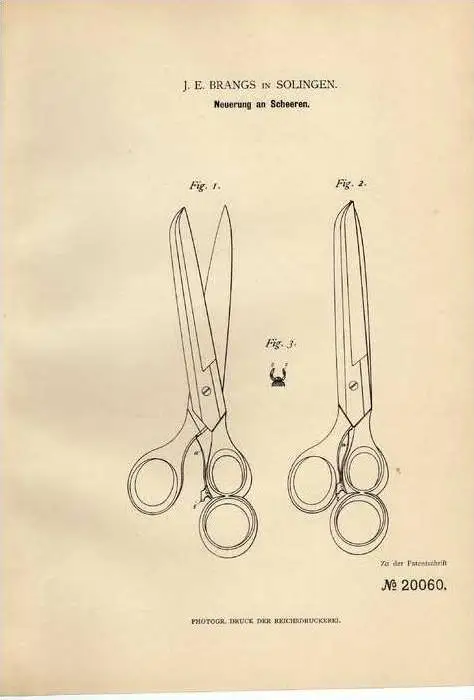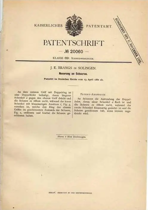 Original Patentschrift - J. Brangs in Solingen , 1882 , Scheere , Messer !!!