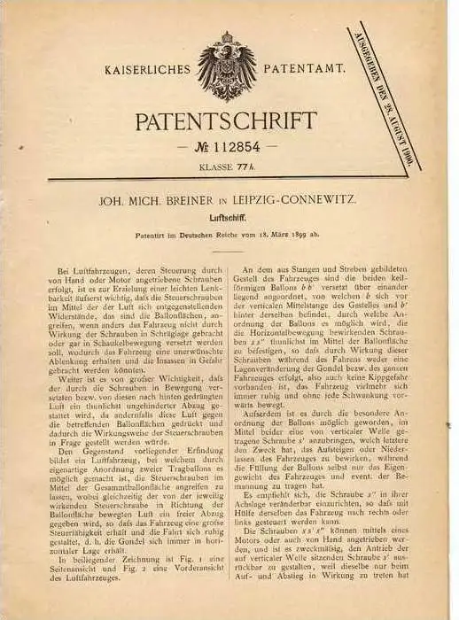 Original Patentschrift - J. Breiner in Leipzig - Connewitz , 1899 , Luftschiff , Luftfahrzeug !!!