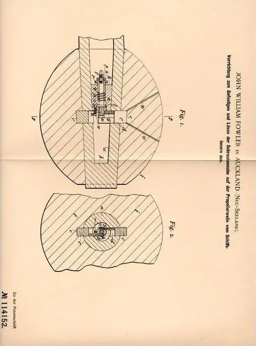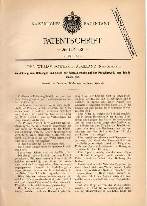 Original Patentschrift - J. Fowler in Auckland , Neuseeland , 1900 , Vorrichtung für Propellerwellen von Schiffen !!!
