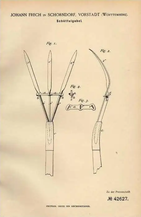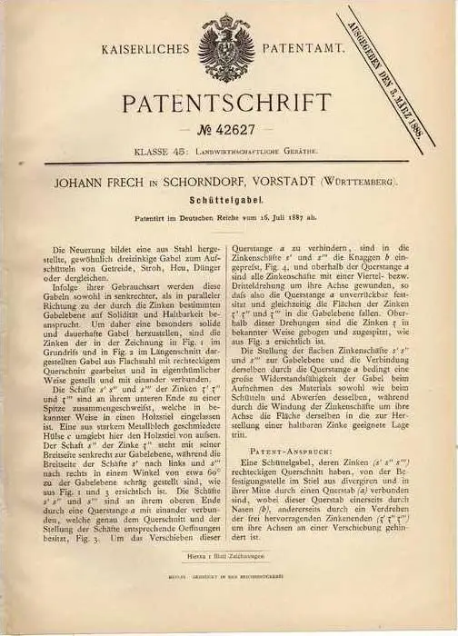 Original Patentschrift - J. Frech , 1887 , Schüttelgabel , Landwirtschaft , Bauer !!!