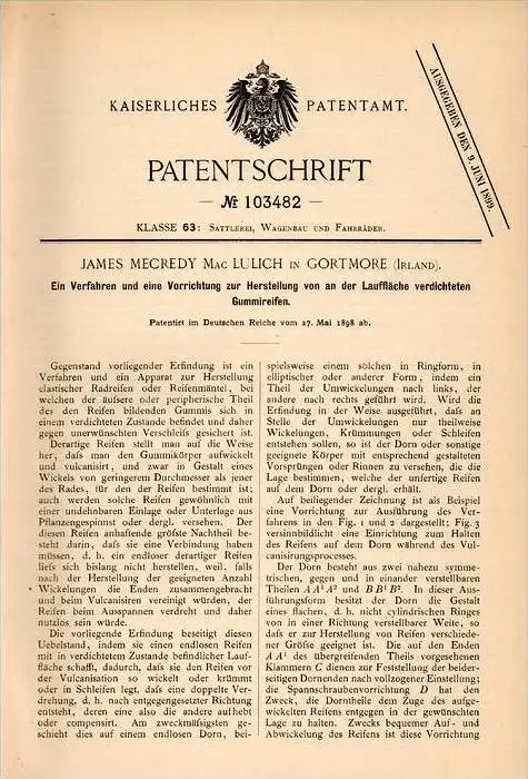Original Patentschrift - J. Lulich in Gortmore , 1898 , production of compacted tire , Ireland , Swanlinbar !!