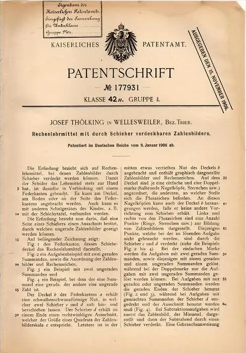 Original Patentschrift - J. Thölking in Wellesweiler b. Neunkirchen , 1906 , Rechenlehrmittel , Mathematik , Schule !!!