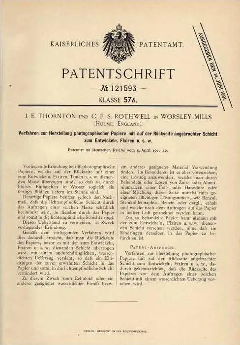 Original Patentschrift - J, Thornton in Worsley Mills , 1900, Photographie , Entwicklung , Photo , Hulme , England !!!