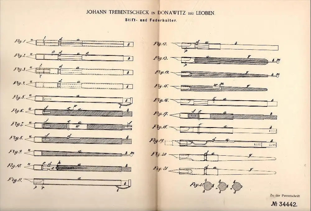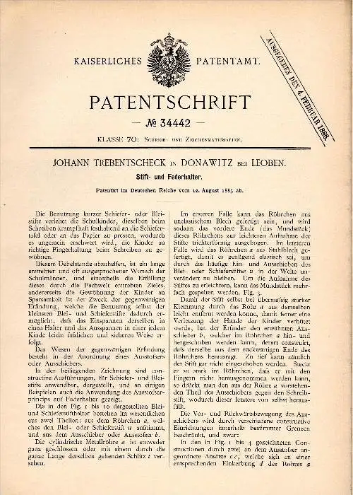 Original Patentschrift - Johann Trebentscheck in Donawitz b. Leoben , 1885 , Stift- und Federhalter , Steiermark !!!