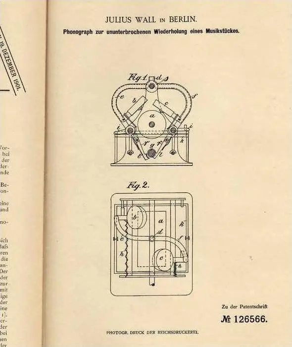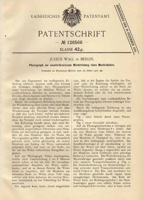 Original Patentschrift - Julius Wall in Berlin , Phonograph , 1901 , Grammophon , Musik !!!