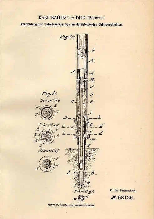 Original Patentschrift - Karl Ballin in Dux / Duchcov , Böhmen , 1890 , Entwässerung von Gebirgsschichten , Bergbau !!!