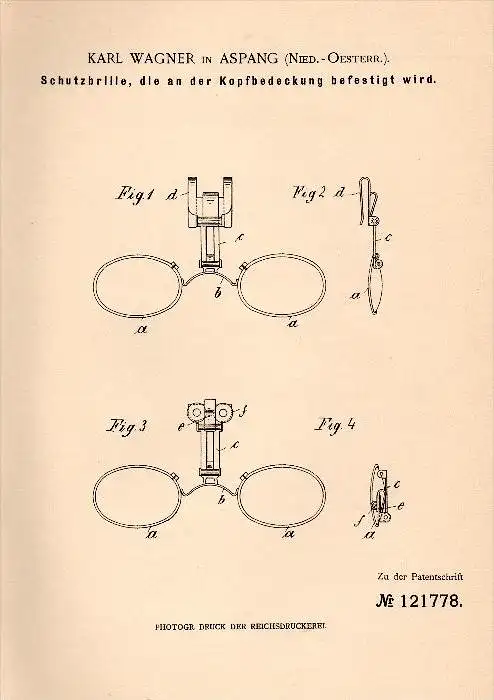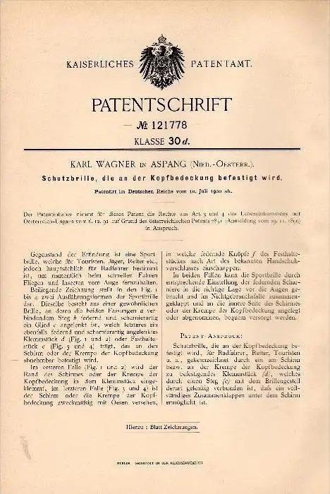 Original Patentschrift - Karl Wagner in Aspang , Niederösterreich , 1900 , Schutzbrille für Jäger , Reiter , Radfahrer !