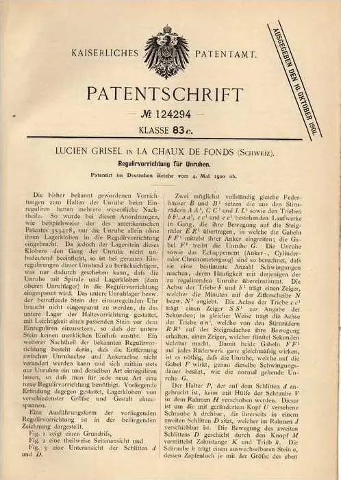 Original Patentschrift - L. Grisel in La Chaux de Fonds , Schweiz , 1900 ,Regulierung für Unruhen v. Uhren , Chronometer
