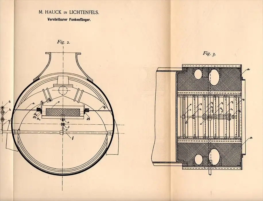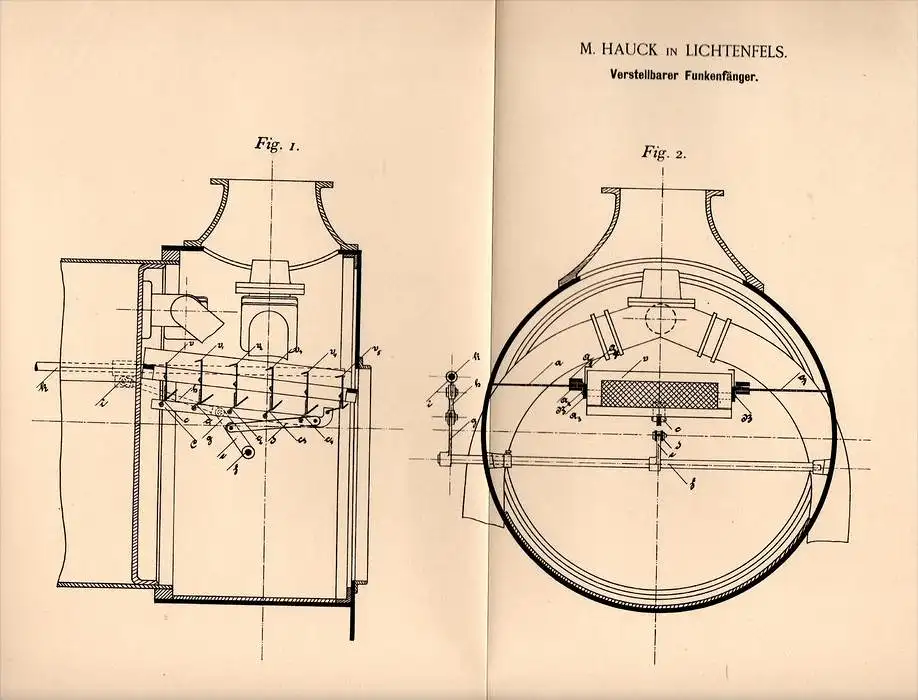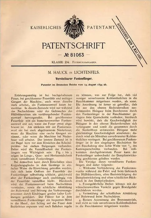 Original Patentschrift - M. Hauck in Lichtenfels i. Bayern , 1894 , verstellbarer Funkenfänger , Feuerung , Heizung !!!