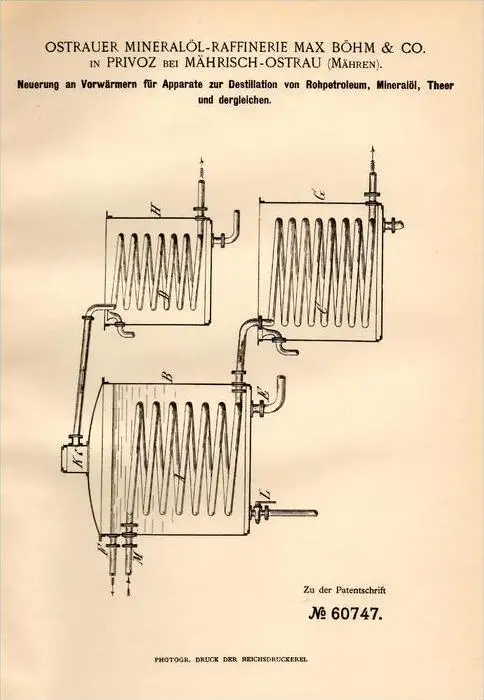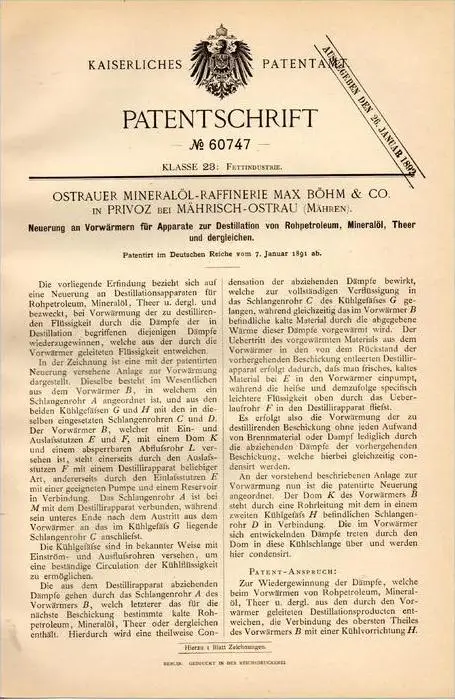 Original Patentschrift -Mineralöl - Raffinerie Max Böhm & Co in Privoz b. Ostrava ,1891, Destillation von Öl , Petroleum